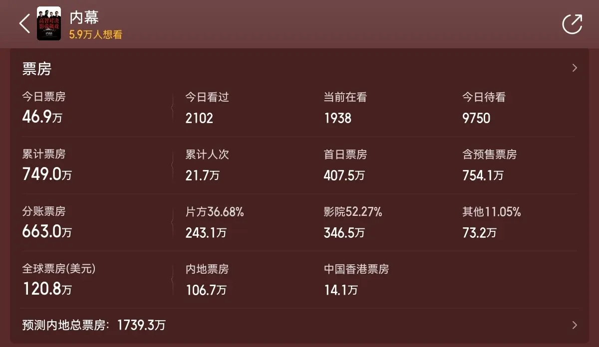 《内幕》上映3天,拿下了749万票房,预测内地总票房仅1700万。